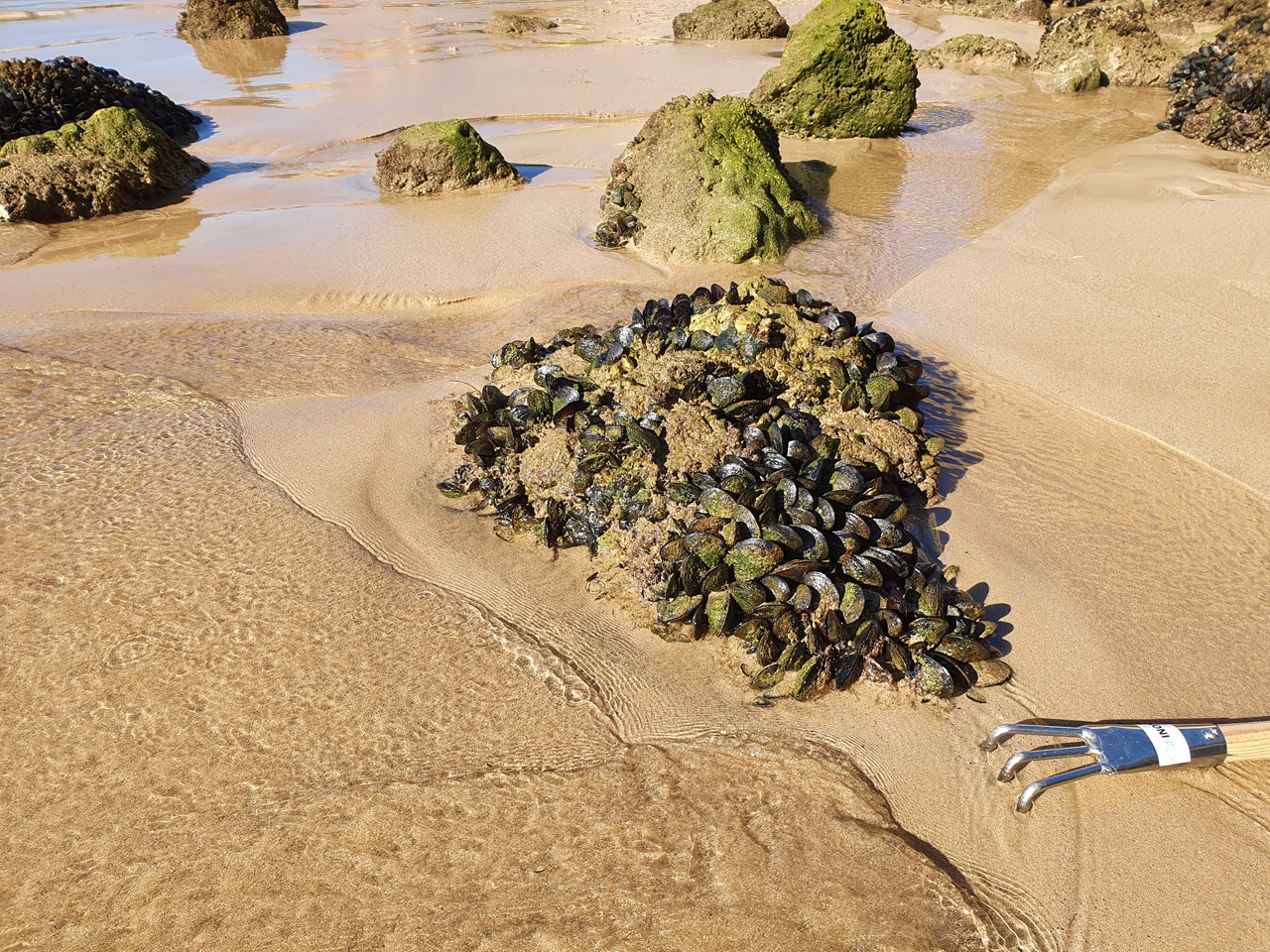 Bei Niedrigwasser gehe ich noch eine Runde um die Felsen und kann einen Eimer Mies-Muscheln fürs Abendessen sammeln…